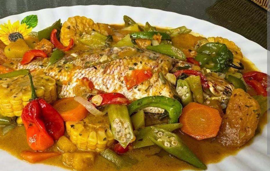 This wholesome dish is a complete meal, accompanied by a generous medley of fresh vegetables that have soaked up the delicious sauce. Enjoy sweet corn on the cob slices, tender okra, crisp carrots, and colorful bell peppers. Whole Scotch bonnet peppers are simmered in the broth to provide an authentic, fiery kick that balances the natural sweetness of the seafood.